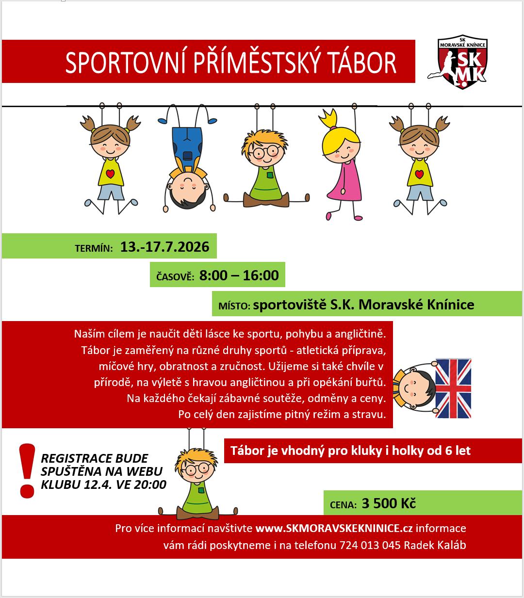 Našim cílem je naučit děti lásce ke sportu a pohybu. Příměstský tábor, který se bude konat 13.-17.7.2026 v Moravských Knínicích je zaměřen na všeobecnou sportovní průpravu, obratnost a zručnost. Děti si užijí chvíle v přírodě, zábavu v Brunu na výletě nebo při opékání špekáčků. Na každého čekají zábavné soutěže, odměny a ceny. Po celý den bude zajištěno jídlo i pitný režim :-)